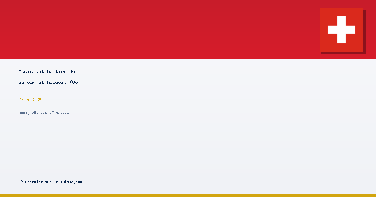 Devenez Assistant Office Management et Réception chez Forvis Mazars. Rejoignez un environnement collaboratif où le respect et l'ouverture priment.TâchesAccueillir clients et candidats, représentant l'entreprise.Gérer les services administratifs et la correspondance.Organiser des événements internes et externes avec soin.CompétencesFormation commerciale requise et expérience similaire appréciée.Excellentes compétences organisationnelles et autonomie.Maîtrise de l'allemand et de l'anglais, le français est un plus.Assistant Gestion de Bureau et Accueil (60 - 80%)(60-80%)À propos de ce posteDans notre quotidien, la règle est la suivante :Nous nous tutoyons, nous vivons le respect mutuel, le travail d'équipe et une collaboration ouverte. C'est précisément là que vous intervenez : en tant queAssistant Gestion de Bureau & Accueil (60–80%), vous êtes le premier point de contact dans notre bureau et vous marquez la première impression auprès des client·e·s, candidat·e·s et collaborateur·trice·s. Vous veillez à ce que l'accueil, les services de bureau et les processus administratifs fonctionnent sans accroc – avec un talent d'organisation, une orientation service et un œil pour le détail.Si vous aimez prendre des responsabilités, appréciez la variété et souhaitez participer activement à la gestion quotidienne du bureau, nous sommes impatients de faire votre connaissance.Vos tâchesCoordination de l'accueil et gestion de bureau :Accueil et prise en charge des client·e·s, accueil et prise en charge des candidat·e·sService postal : réception et distribution du courrier & traitement du courrier et des colisResponsabilité de l'organisation d'événements internes et externesRéponse et transfert des correspondances par email et administration téléphoniqueSoutien à la gestion des installations, y compris la gestion du matériel de bureau et des badges (ZH ainsi que soutien pour BE/BS)Support de premier niveau pour les équipements de bureau (par ex. MS TEAMS, imprimantes)Organisation des structures de classement et d'archivageParticipation aux projets de gestion de bureau et soutien administratif dans les projets internesSoutien à la gestion des voyagesPersonne de contact pour les demandes et préoccupations des collaborateurs pour le bureau de Zurich et soutien pour les bureaux BE / BSInterface avec les RH lors de l'intégration et du départ (entrées/sorties)Votre profilVous avez une formation commerciale de base achevéeVous avez une expérience professionnelle dans un poste similaireVous faites preuve d'initiative, d'autonomie et de capacité à vous imposerVous êtes un talent de l'organisation et avez une méthode de travail structuréeVous avez de bonnes connaissances en allemand et en anglais, la connaissance du français est un plusPourquoi Forvis MazarsVous bénéficiez de défis variés et d'un domaine de responsabilité propreUne équipe internationale et multiculturelle de professionnels hautement motivésUn environnement collégial où la confiance et le respect sont vécusDes conditions d'emploi attractives et un lieu de travail moderneMettre vos forces à profit et apporter une contribution précieuse au succès de l'entrepriseChez Forvis Mazars, la diversité et l'intégration sont au cœur de nos valeurs. Nous sommes convaincus qu'une culture d'entreprise qui favorise la diversité et l'inclusion nous renforce en tant qu'organisation.Nous nous efforçons constamment de recruter des collaborateurs qui reflètent la diversité de nos parties prenantes, indépendamment de leur origine ethnique, nationalité, handicap, croyance ou conviction, milieu social, âge, orientation sexuelle et identité de genre. Forvis Mazars sélectionne les candidates et candidats en fonction de leurs compétences, connaissances, qualifications et expériences.Forvis Mazars Group SC est un membre indépendant de Forvis Mazars Global, un réseau leader de services professionnels. En tant que partenariat intégré internationalement, le groupe Forvis Mazars est actif dans plus de 100 pays et régions du monde et spécialisé dans les domaines de l'audit, de la fiscalité et du conseil. Le partenariat s'appuie sur l'expertise et le savoir-faire culturel de plus de 40 000 collaborateurs dans le monde entier pour soutenir les client·e·s de toutes tailles à chaque étape de leur développement. En Suisse, plus de 400 expert·e·s travaillent dans dix sites différents.forvismazars.com/ch/deInformations pour les recruteursForvis Mazars n'accepte pas de candidatures non sollicitées de la part de recruteurs pour ce poste sans accord préalable. Les recruteurs sont donc priés de ne pas envoyer de documents à nos collaborateurs ni via notre site carrière. Nous déclinons toute responsabilité pour les candidatures non sollicitées ainsi que pour d'éventuels frais et vous remercions de votre compréhension.Informations supplémentairesType de posteEmployé à temps partielDate d'entréedès que possibleExpérience professionnelleExpérimentéLieuxZurichResponsableEdita ToskaSpécialiste en acquisition de talents