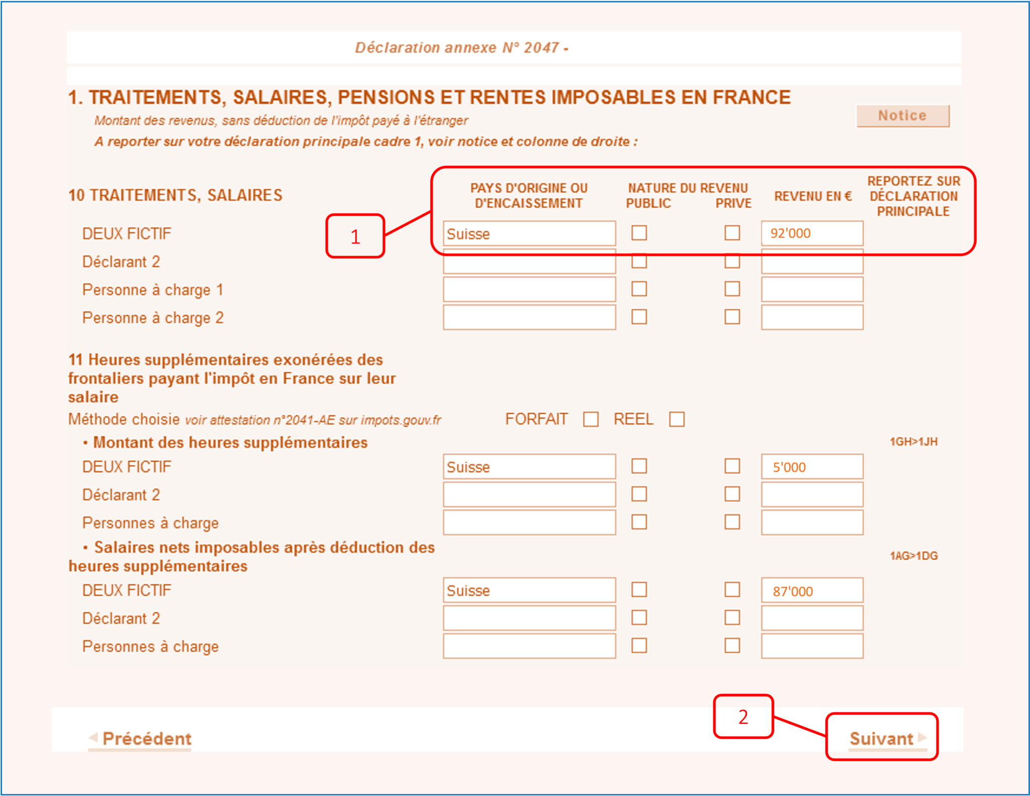 Une fois que vous avez vérifié que vos revenus correspondent bien au niveau de rémunération que vous avez eu précédemment dans le formulaire 2047-Suisse, vous pouvez passez au suivant. Techniquement, il s’agit d’un report simple sur lequel vous ne pouvez pas faire d’erreur.