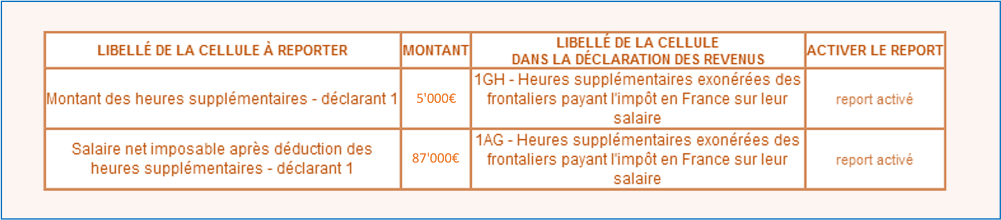 Le « 5’000 € » correspond à vos heures supplémentaires plafonnées au maximum déductible. Ce montant est directement reporté dans la catégorie 1GH dans le formulaire principal que vous pourrez retrouver à la fin.