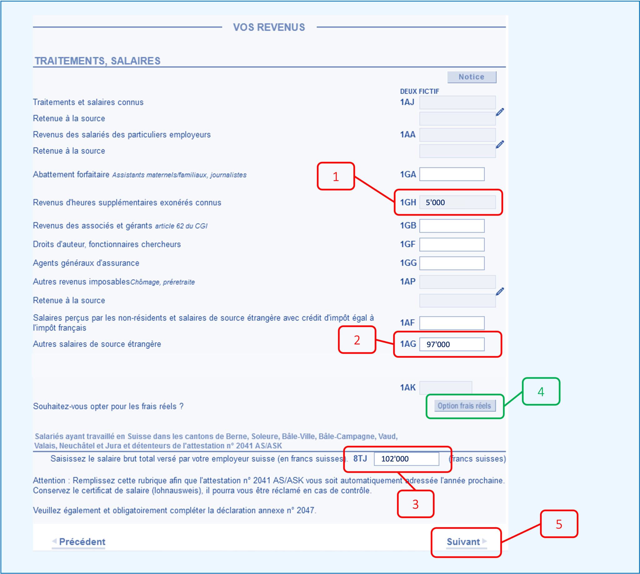- (2): 1AG qui regroupe les salaires perçus en Suisse et qui doivent être imposés en France.