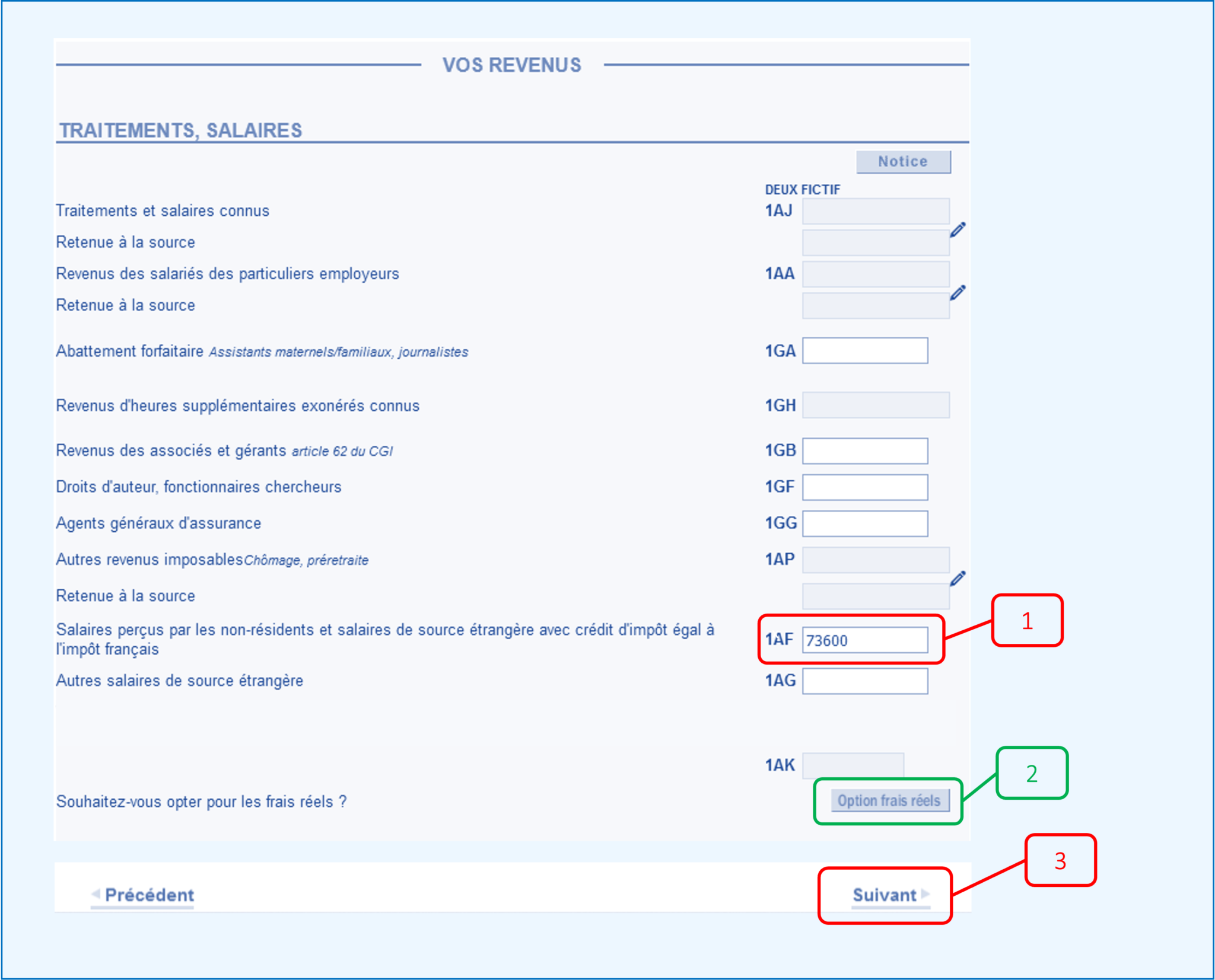 Ne cliquez pas sur suivant pur le moment. Lors de l’étape suivante de notre guide nous allons vous guider pour le choix de déclarer vos frais réels (encadré en vert (3)) ou d’appliquer le barème forfaitaire de 10%.
