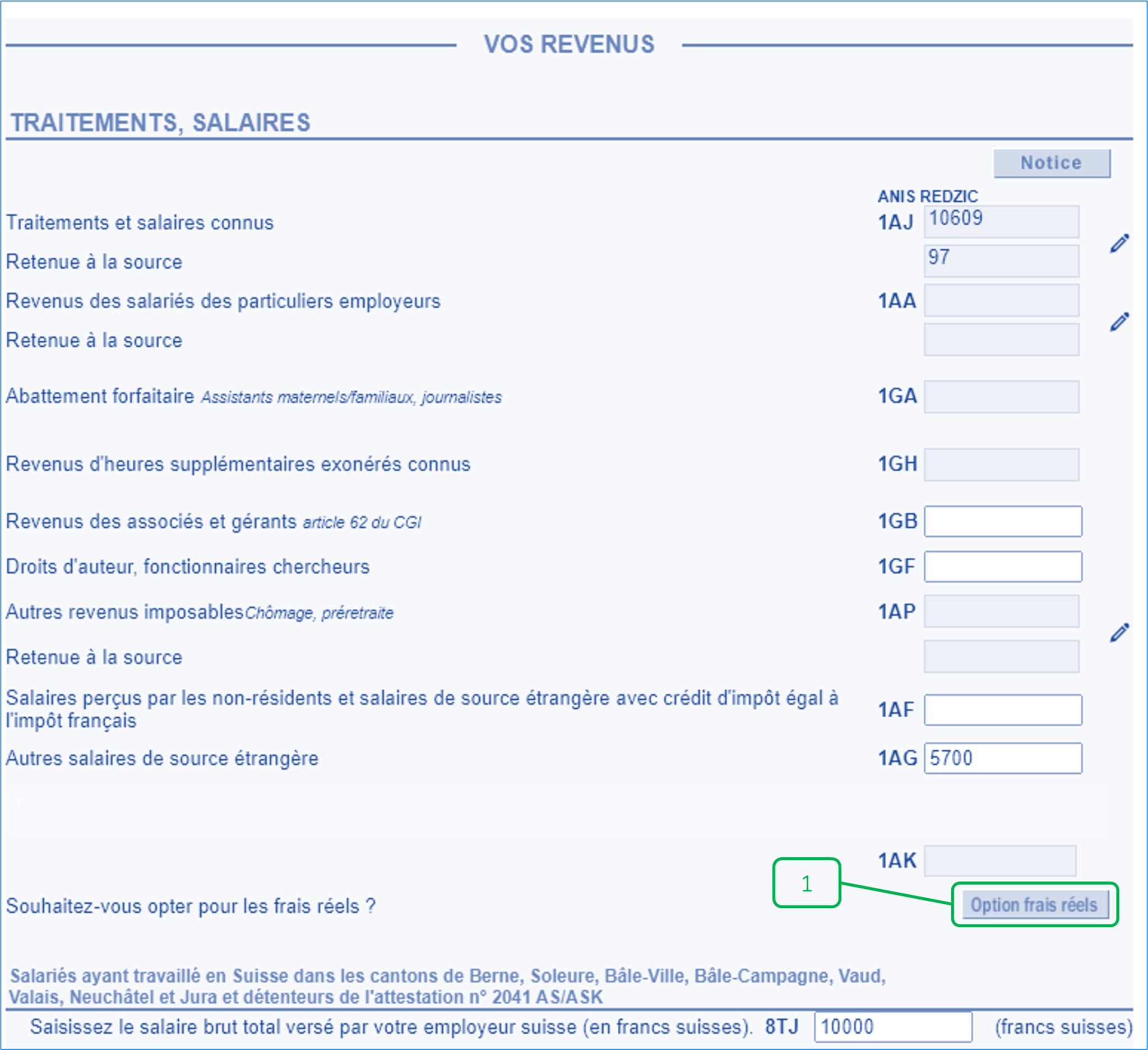 Pour choisir l’abattement de 10% qui est proposé par l’administration fiscale, vous n’avez rien à faire. Vous devez laisser la case « 1AK » vide et passez à l’étape suivante !
