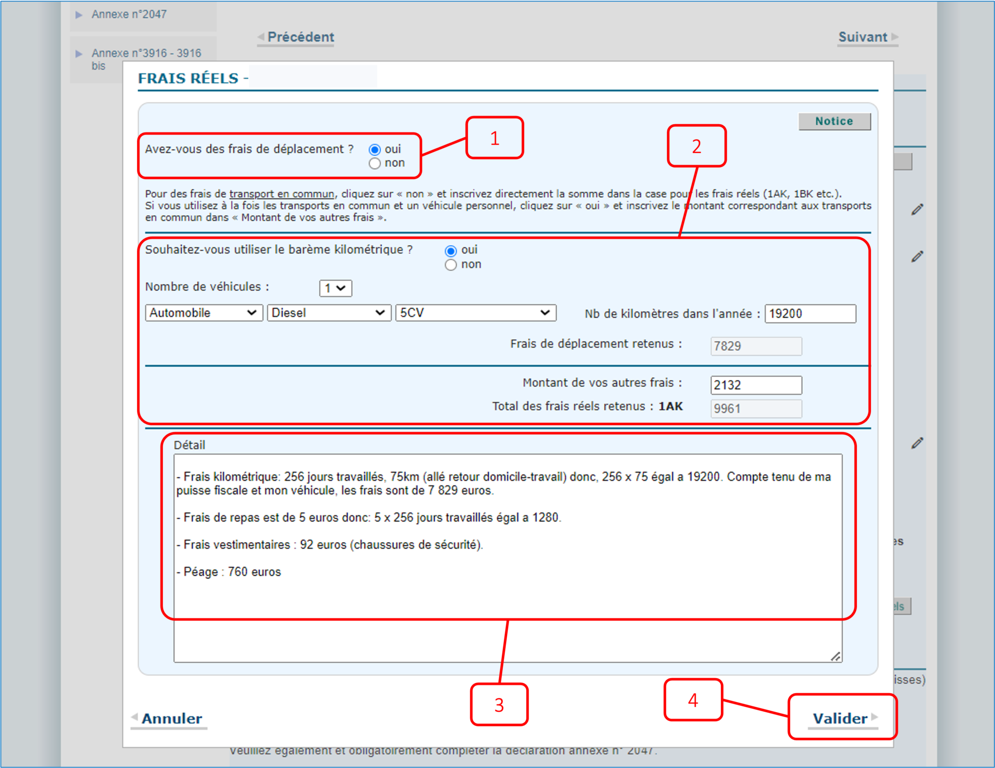 Une fois que vous avez ajouté tous les frais, vous pouvez cliquer sur « Valider ». Vos frais seront alors rajoutés à la case 1AK.