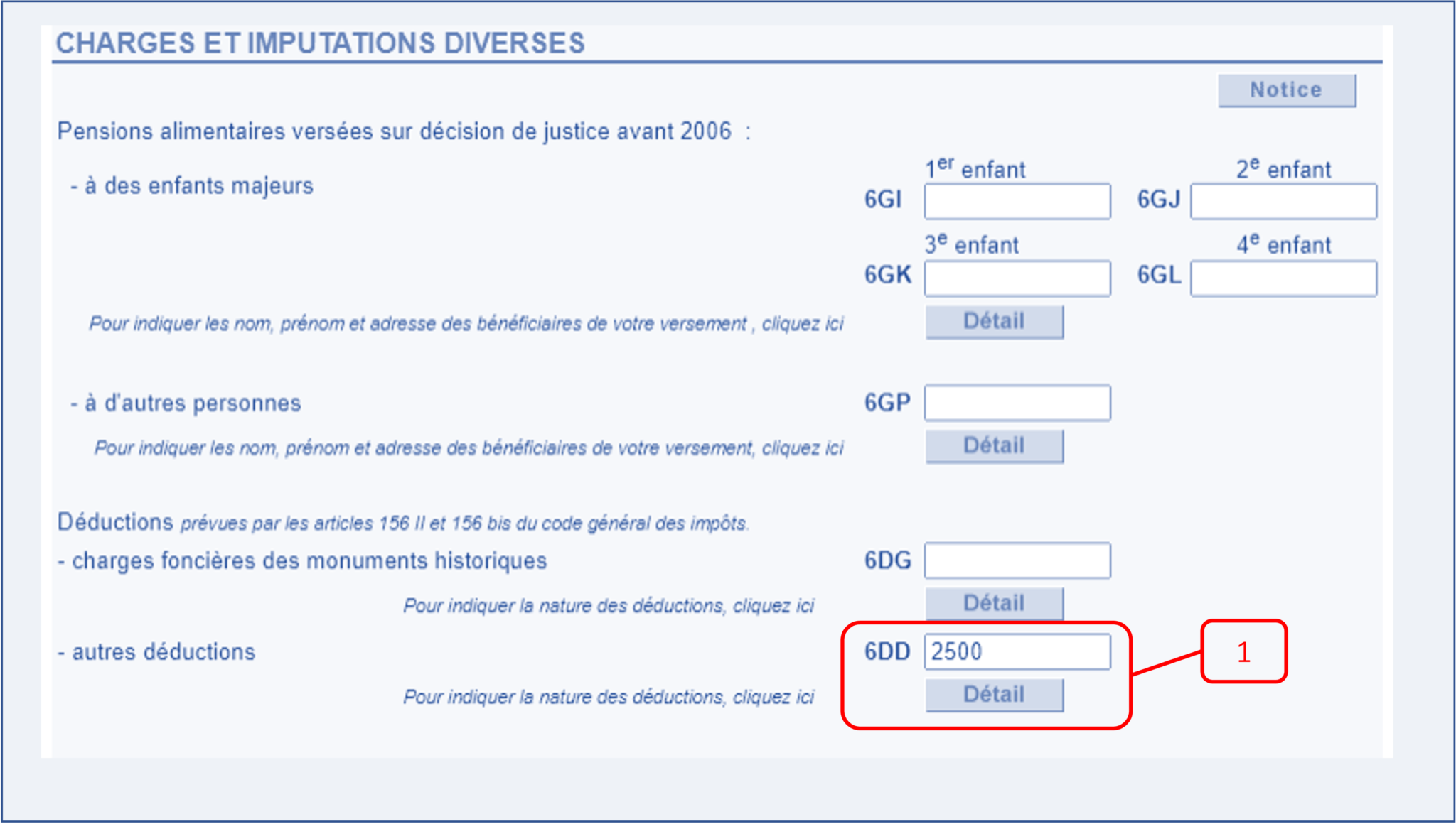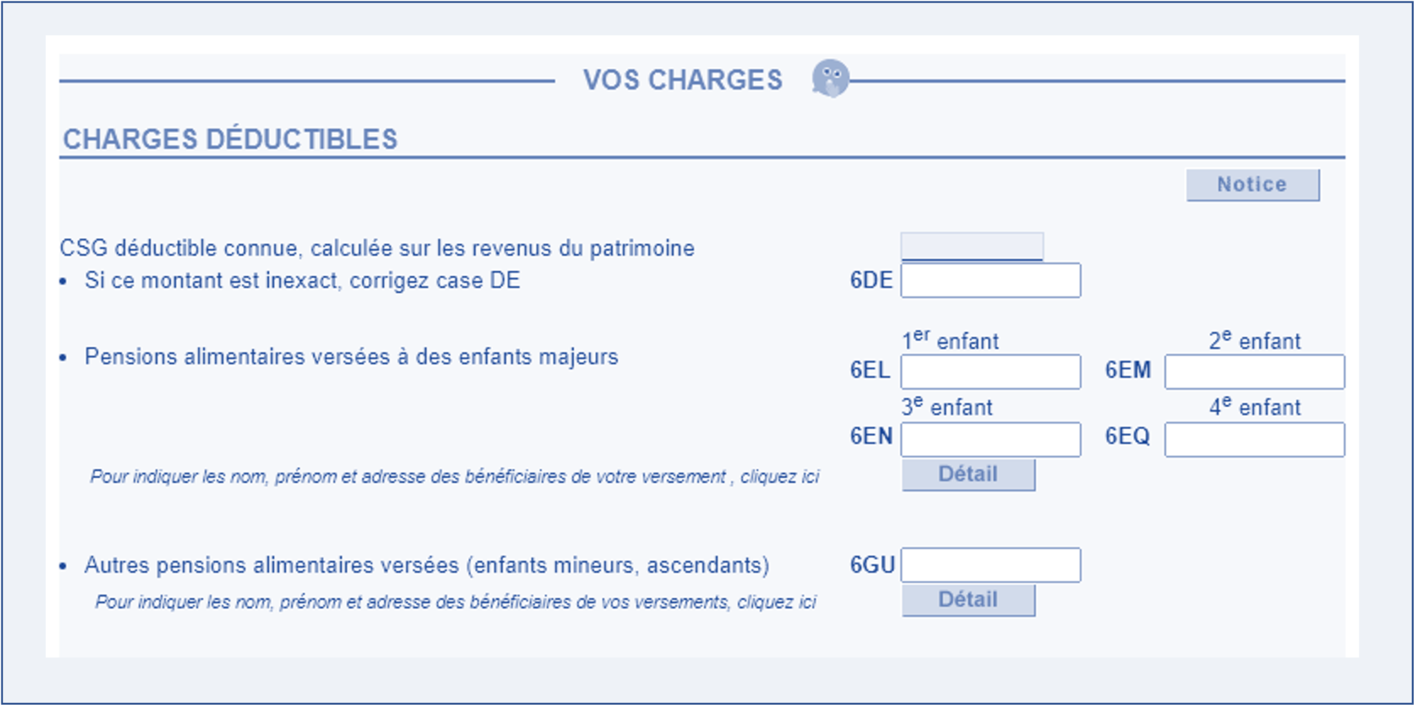 Nous allons lister les principaux points. Lorsque vous indiquez que vous versez une pension alimentaire, vous devez systématiquement le justifier en cliquant sur « Détail ». Indiquez le montant et la désignation de la personne, puis validez.