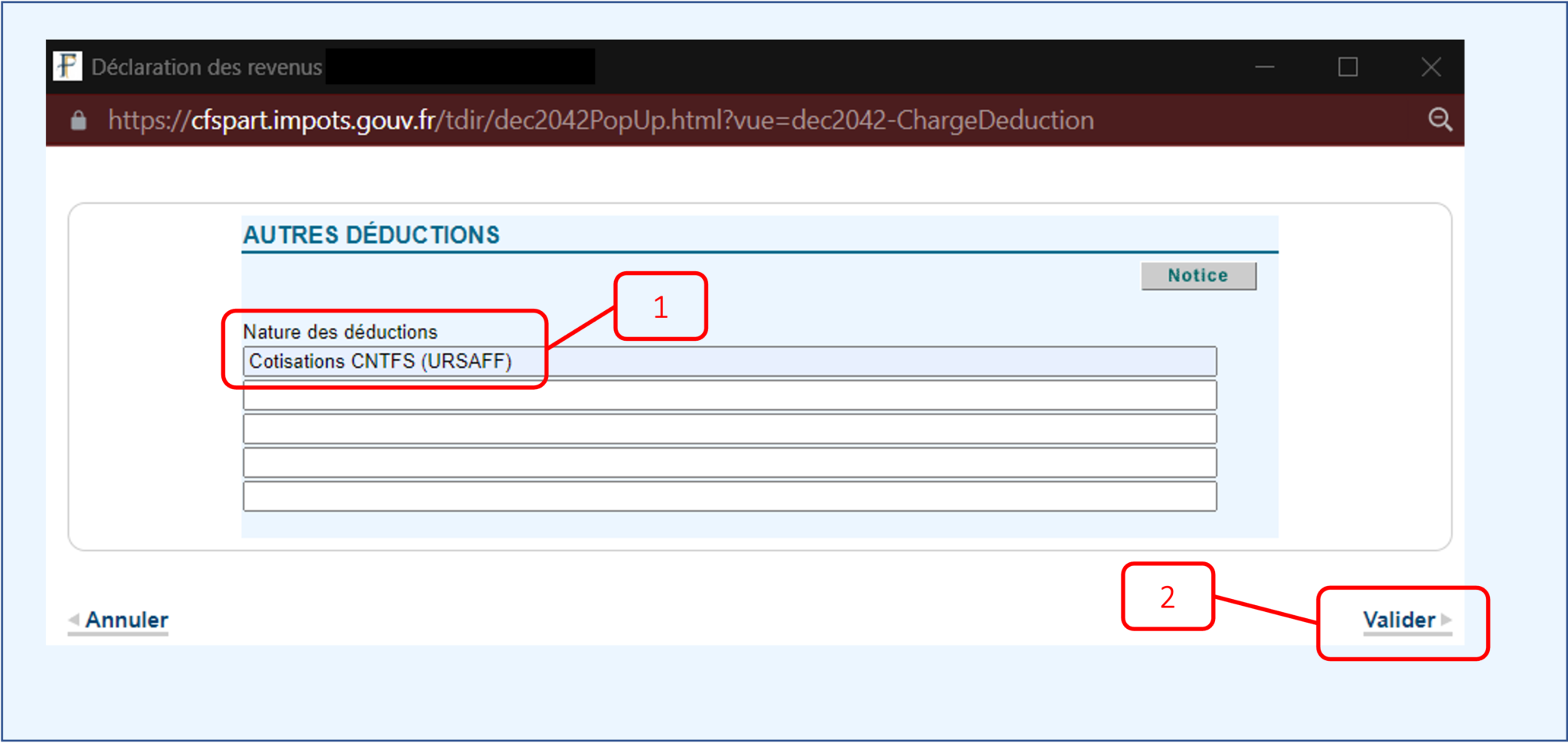 Une fois que vous avez indiqué qu’il s’agissait de votre cotisation CNTFS (1), cliquez sur « Valider » (2), puis vérifier encore une fois tout le formulaire puis cliquez sur « Suivant ».