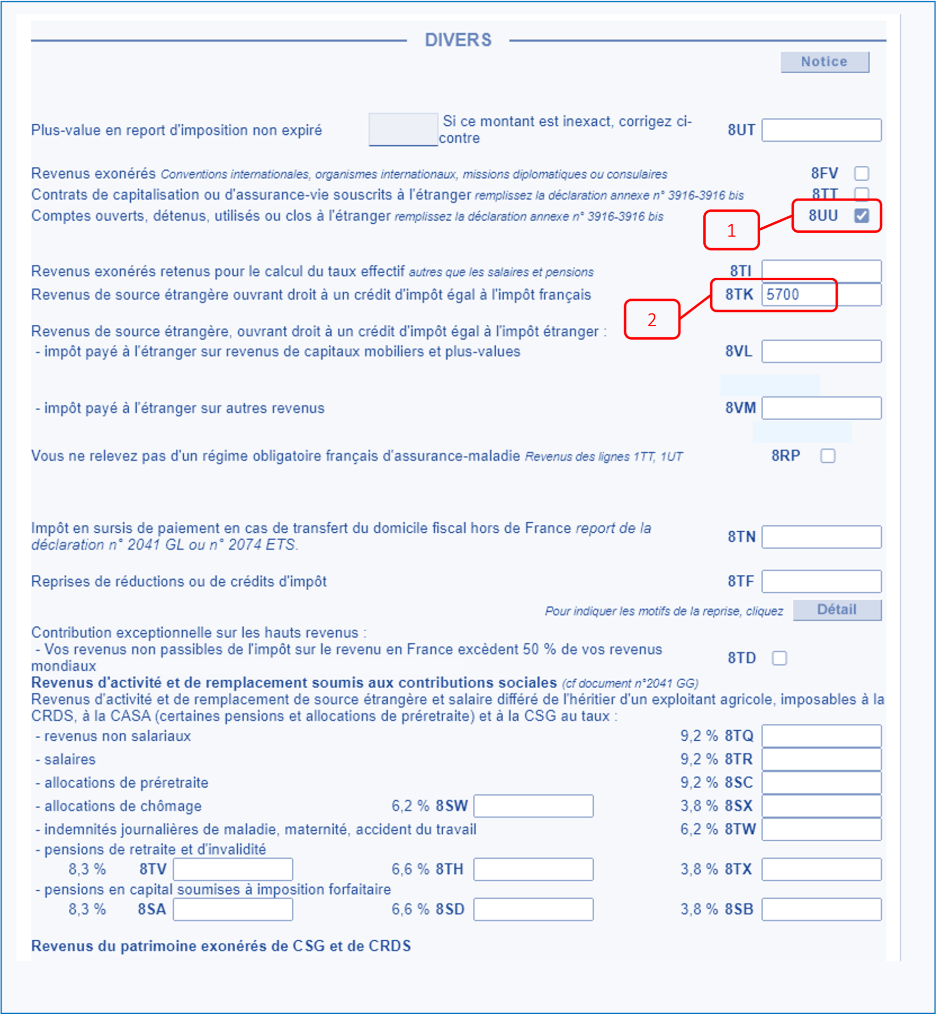 - Lorsque vous indiquez que vous êtes imposé en Suisse directement (notamment les frontaliers genevois), votre case 8TK (2) sera activée et un montant sera indiqué. Ceci est tout à fait normal puisqu’il vous donne droit à un crédit d’impot équivalent à l’impôt francais. Donc les frontaliers genevois, assurez vous qu’un montant figure dans cette case.